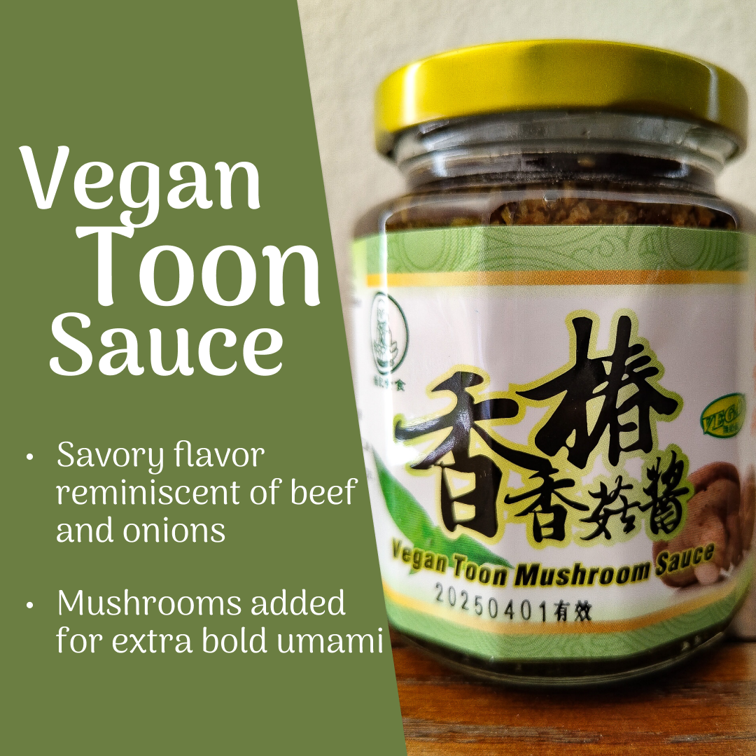 Toon sauce is a popular Chinese and Southeast Asian sauce made of leaves from Chinese Toon Trees (also known as Toona Sinensis, Chinese Mahogany, Chinese Cedar, and Beef and Onion Plant). The young, soft leaves from Chinese Toon Trees are used as vegetables/herbs and have a savory flavor reminiscent of beef and onions. With the addition of mushrooms, our Vegan Mushroom Toon Sauce brings an extra bold layer of umami to all of your dishes.